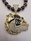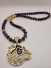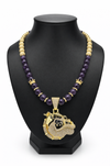 10mm, 24" amethyst necklace with cz bulldog pendant, gold spacers, gold crowns, and gold plated hematite beads